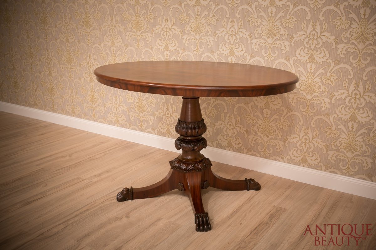 The columnar leg of the table, with its numerous carvings and rich, floral woodcarving, adds chic and elegance to this furniture. Additionally, the whole is supported on four legs that end with lion paws.