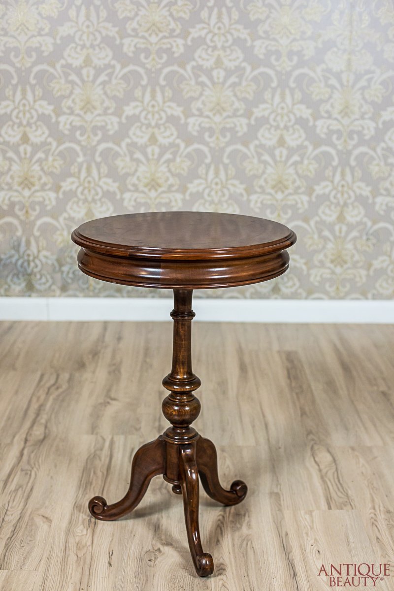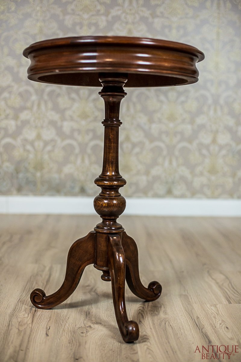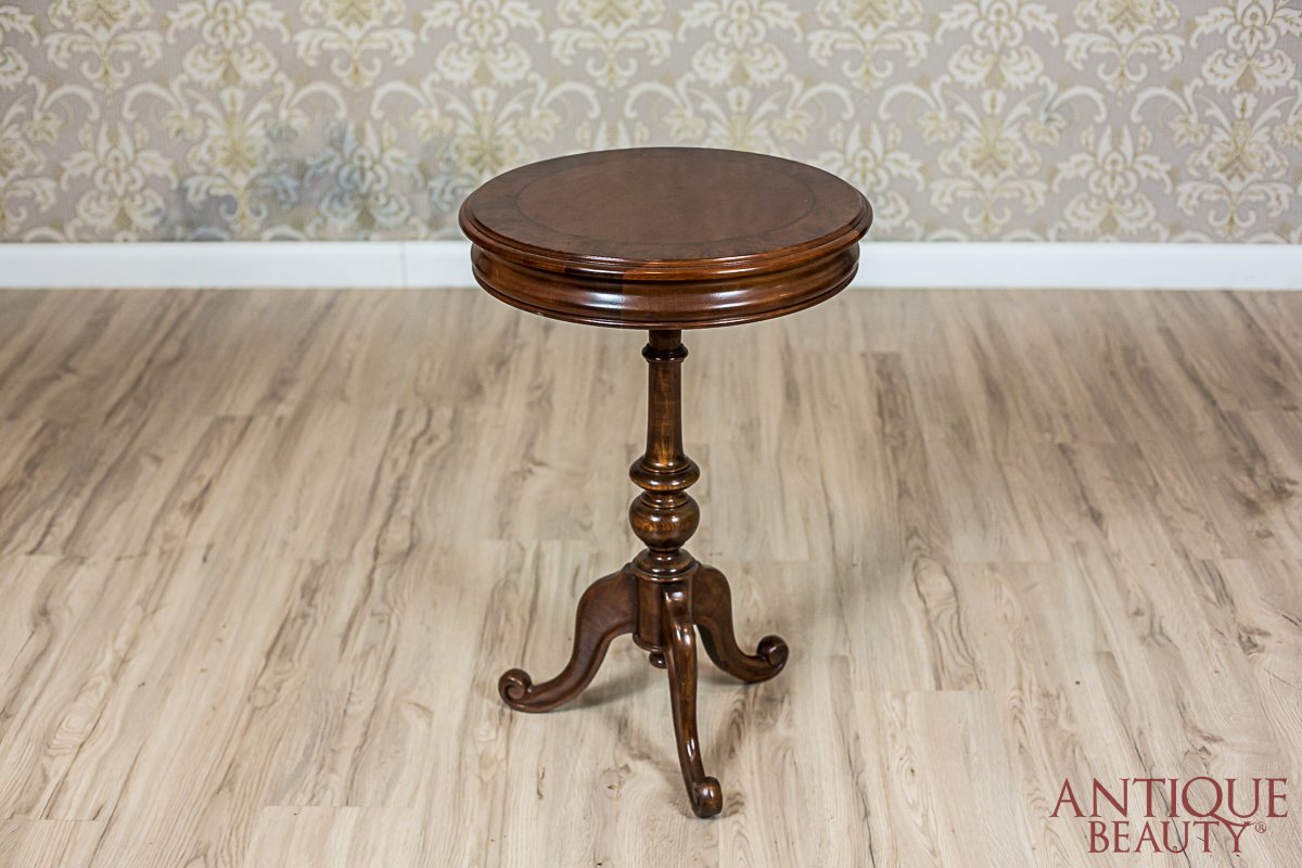 The round table top is supported on a turned pedestal that ends with a tripod