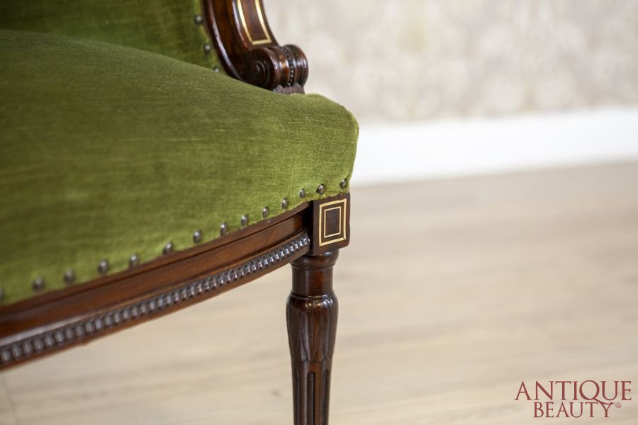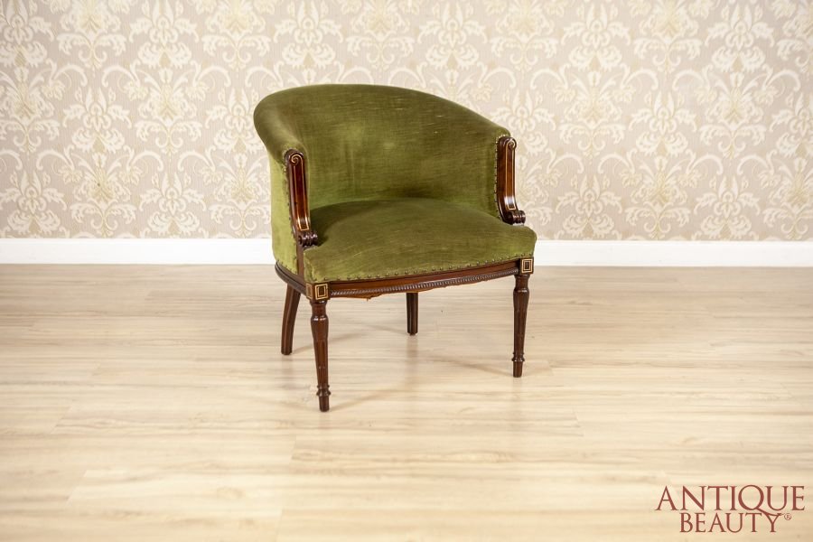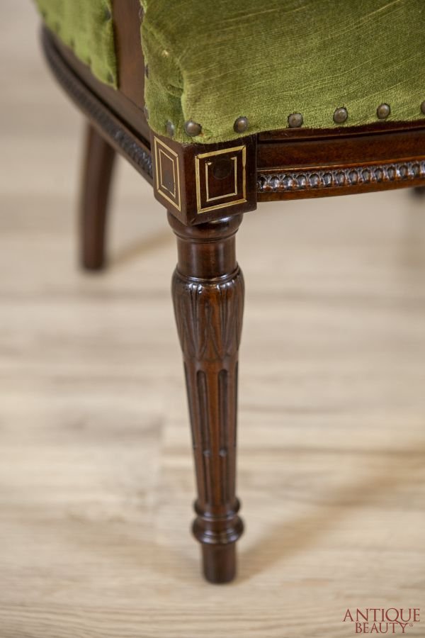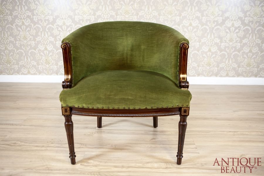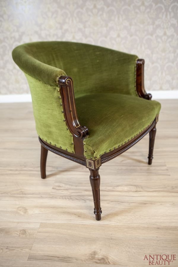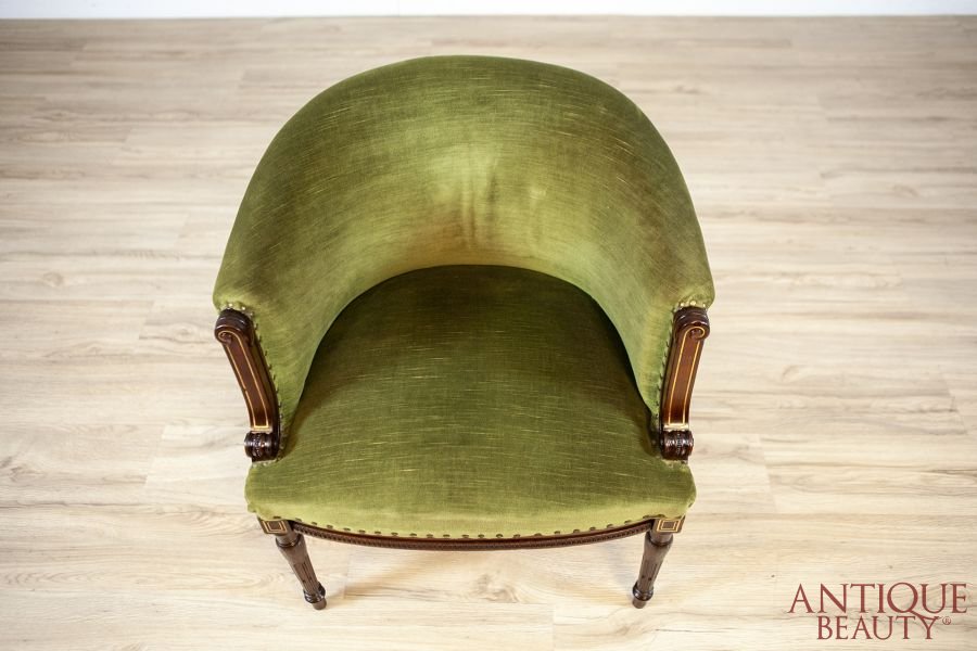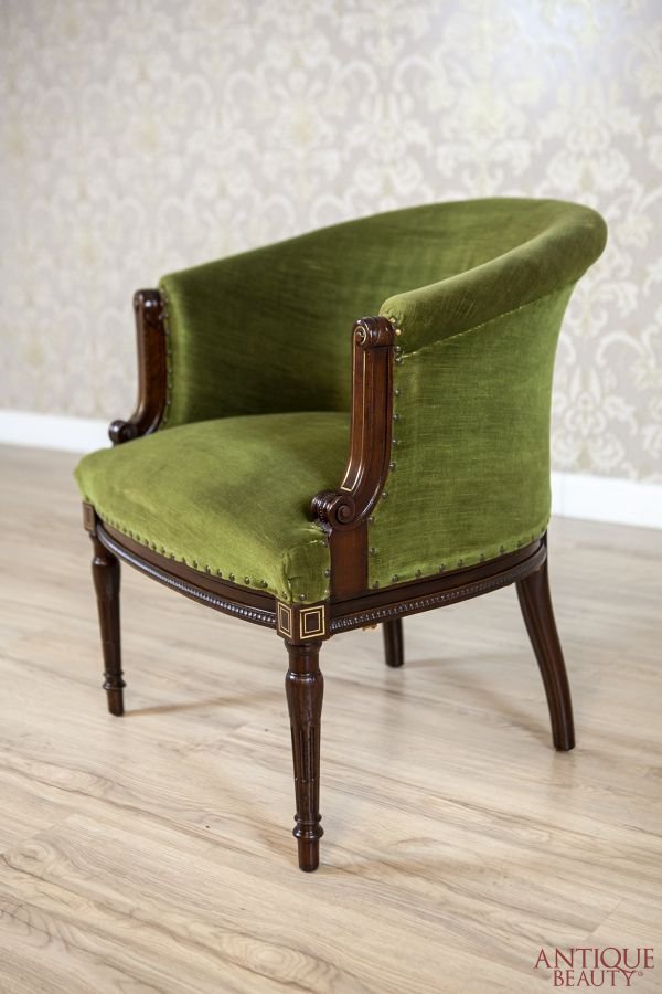 We present you this walnut armchair on rounded legs with original upholstery. The solid backrest is round, whereas the armrests are slightly withdrawn. Furthermore, the armrests and front legs are decorated with an inlay made of a brass vain. The seat is on springs.