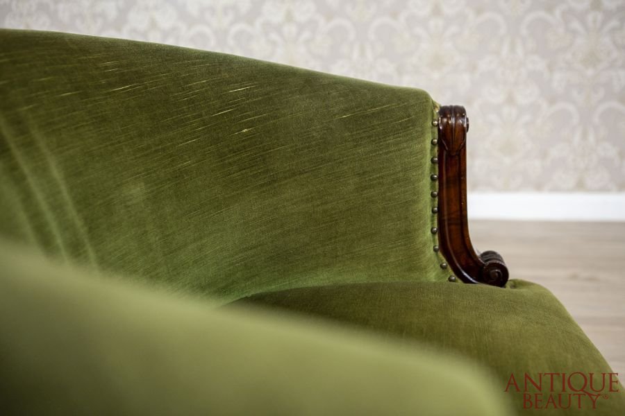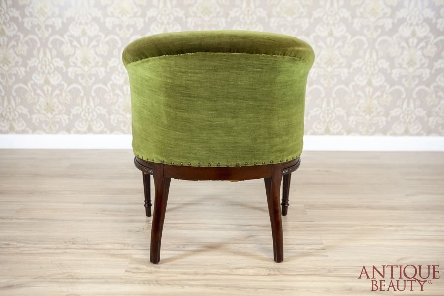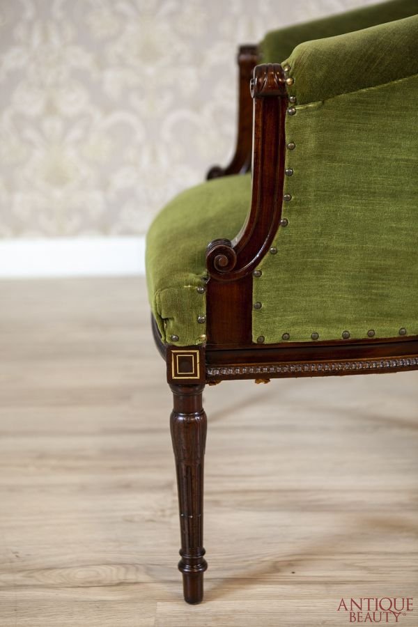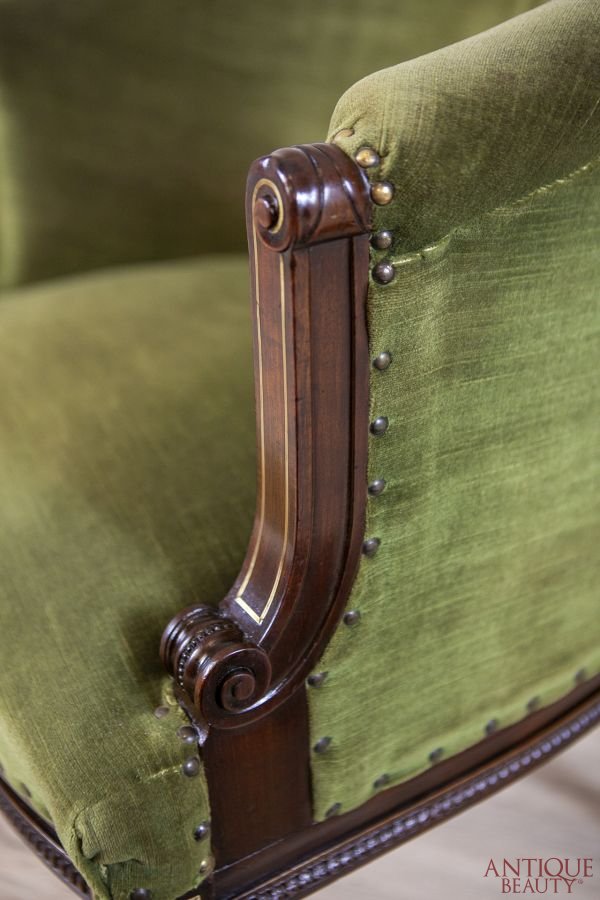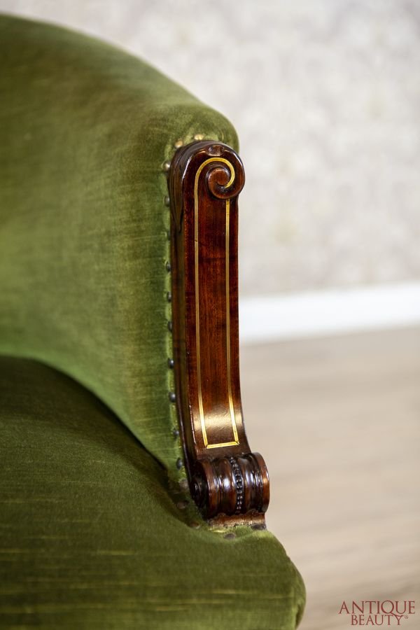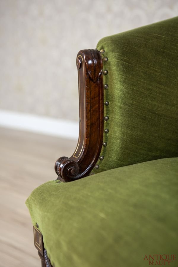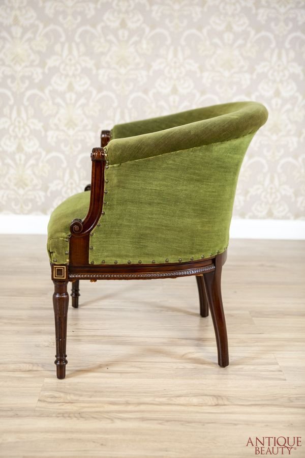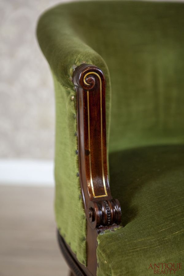 We present you this walnut armchair on rounded legs with original upholstery. The solid backrest is round, whereas the armrests are slightly withdrawn. Furthermore, the armrests and front legs are decorated with an inlay made of a brass vain. The seat is on springs.