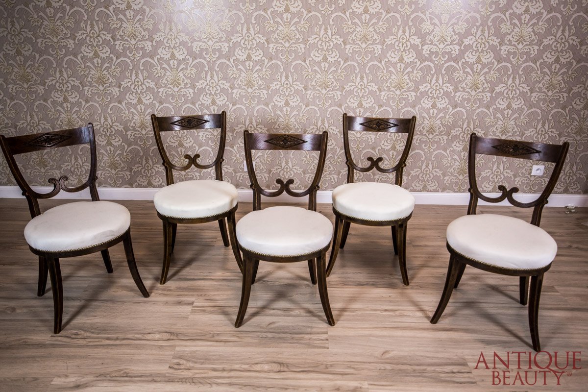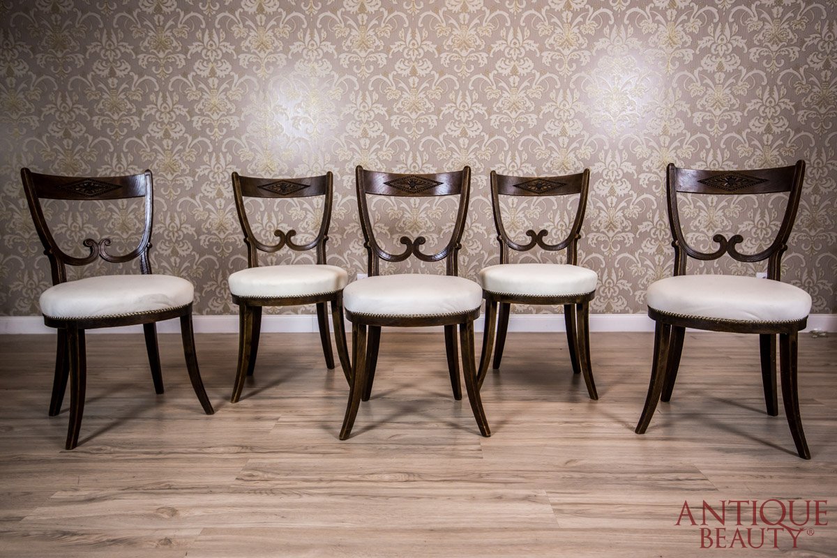 Komplet pięciu krzeseł z drewna dębowego z miękko tapicerowanymi siedzeniami.
