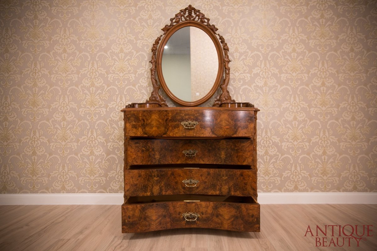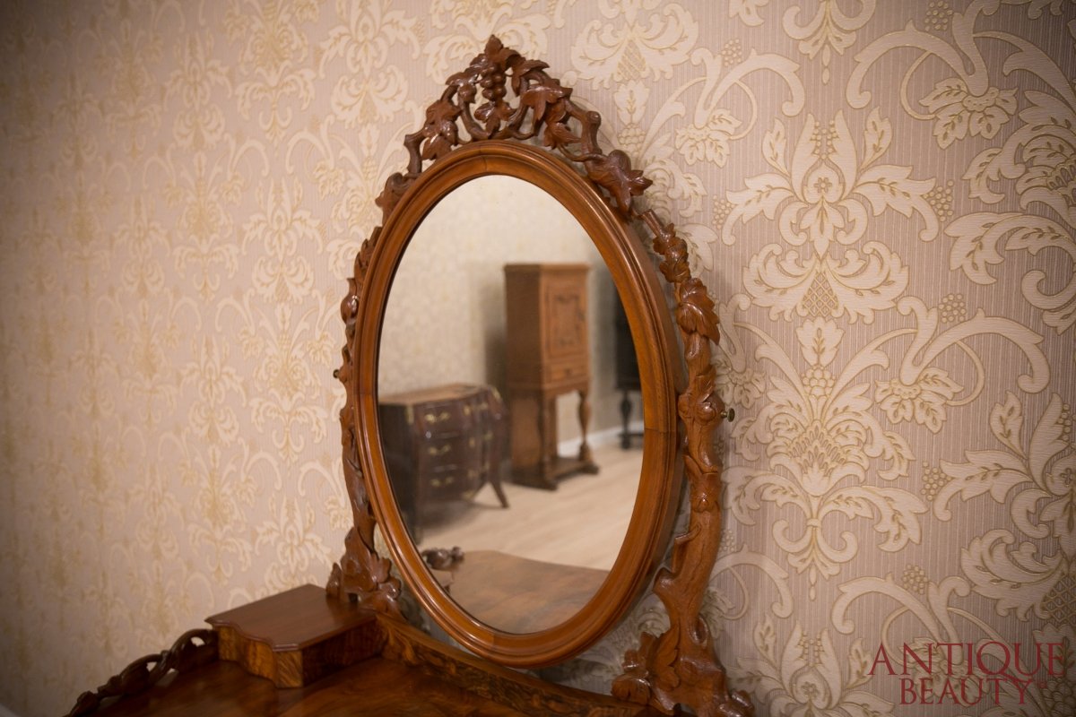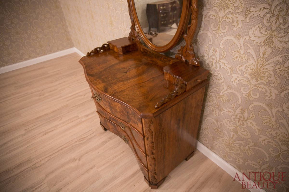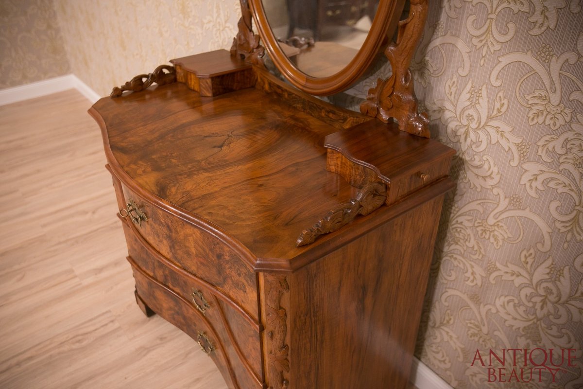 Niesamowicie wytworna i elegancka orzechowa toaletka, to wspaniały unikat w naszej kolekcji. Mebel pochodzi z około 1930 roku i przynależy do stylu neorokoko.