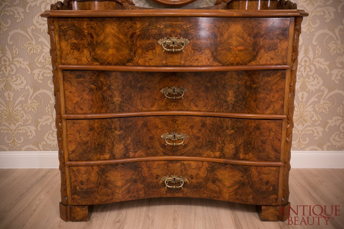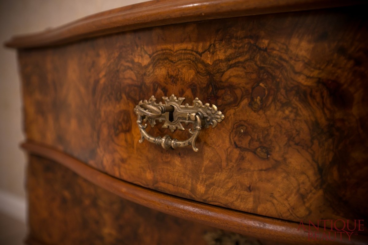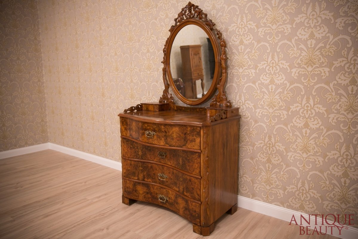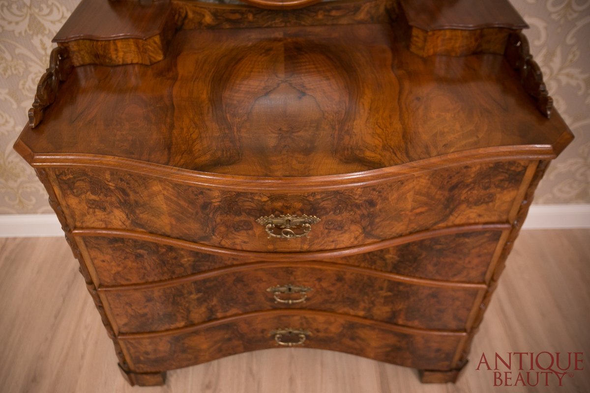 Niesamowicie wytworna i elegancka orzechowa toaletka, to wspaniały unikat w naszej kolekcji. Mebel pochodzi z około 1930 roku i przynależy do stylu neorokoko.
