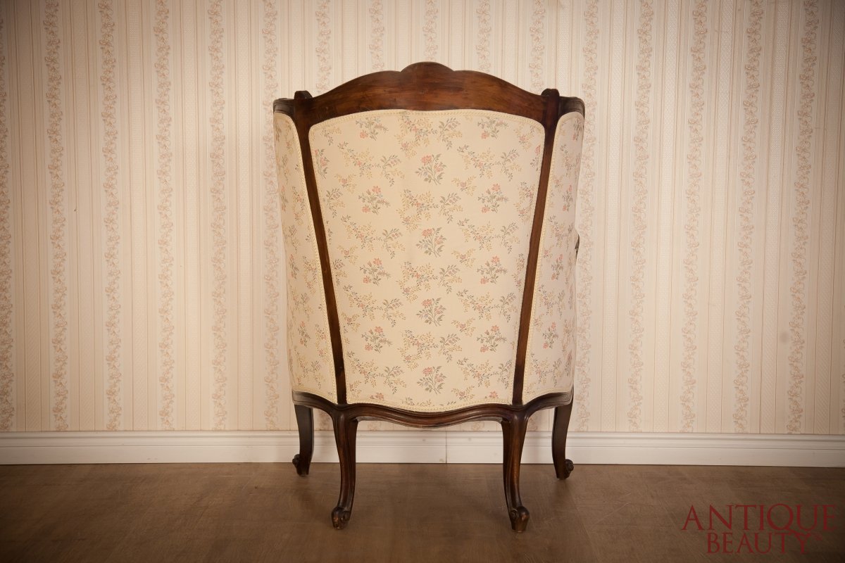 Ich siedziska oraz oparcia obite zostały nową, bardzo elegancką tapicerką w kolorze kremowym o delikatnym wzorze kwiatowym. Berżery zostały wyściełane tkaniną obiciową zarówno z przodu, jak i z tyłu, co umożliwia ustawienie ich w dowolnym miejscu danej przestrzeni.