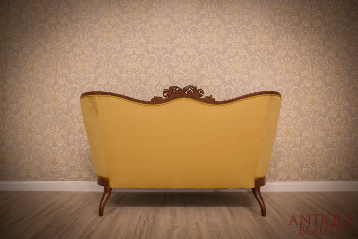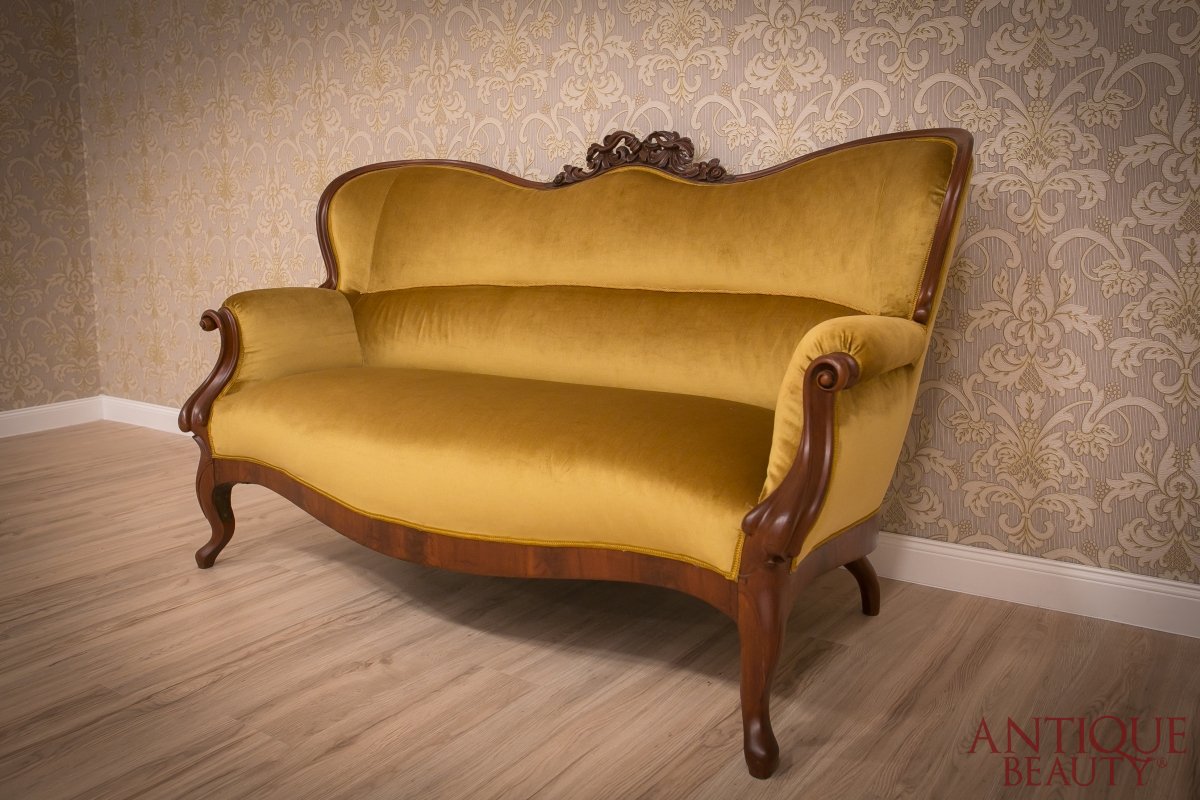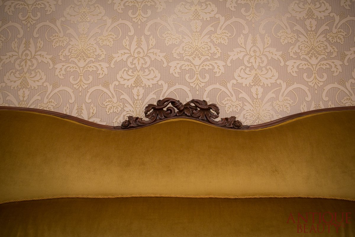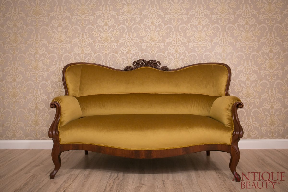Dostojność i elegancja, to znamiona stylu ludwikowskiego i wyjątkowej sofy z 1920 roku prezentującej cechy tego klasowego poziomu. Kanapa wykonana została z drzewa orzechowego i posiada piękne elipsowate oparcie z odgiętymi na boki uszami. Szczyt ramiaka górnego zdobi rzeźbiona kompozycja, której środek osi ożywia ażurowy motyw liścienny.